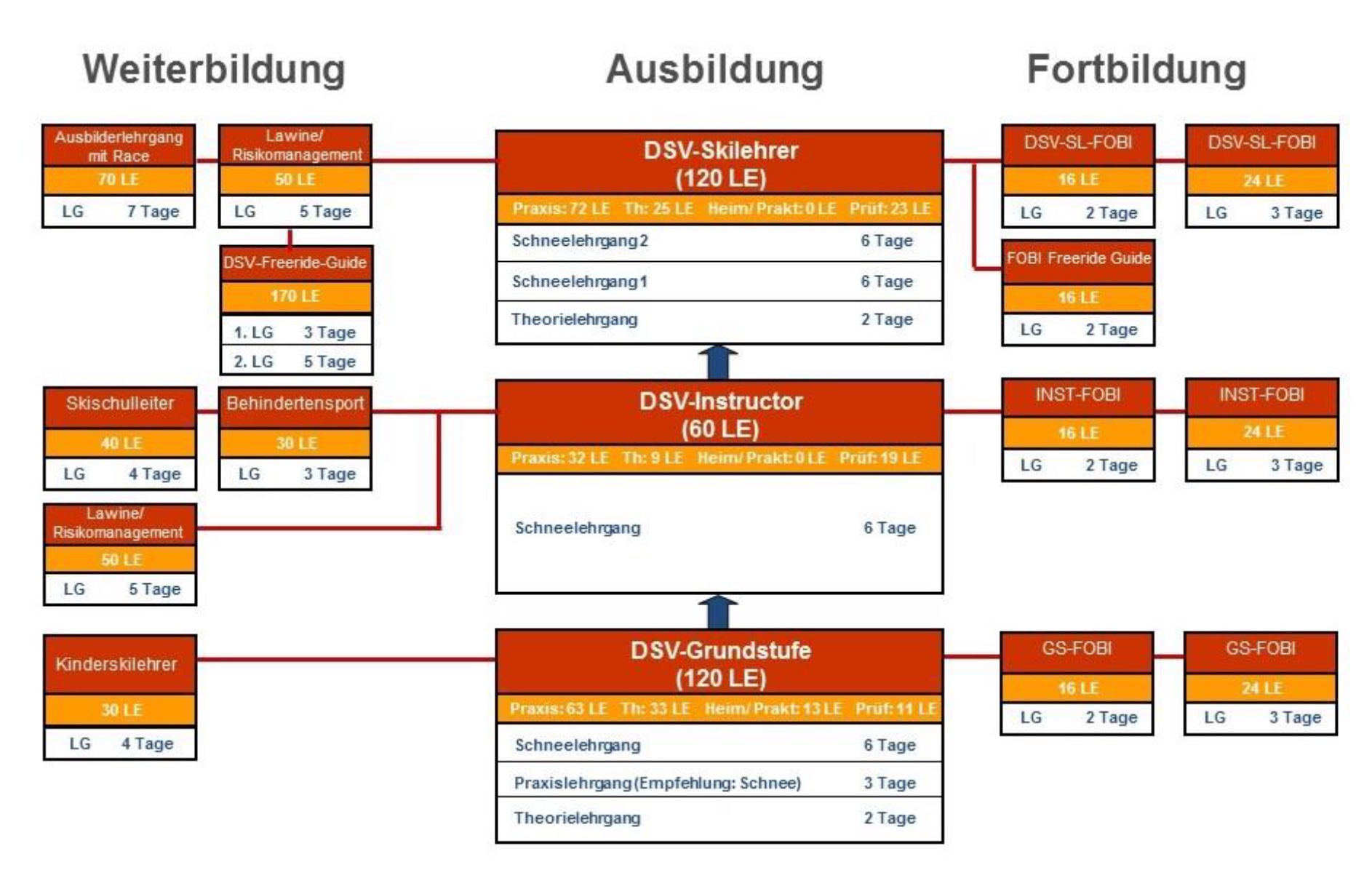 AusbildungLiebe Wintersportfreunde, viele von Euch nehmen das erste Mal an einer Ski- und Snowboardlehrerausbildung teil. Daher möchten wir Euch nachfolgend über einige allgemeine Dinge der Ausbildung informieren. Um an einer Ausbildung im NSV teilzunehmen, musst Du Miglied in einem, dem NSV angeschlossenen Verein, sein. Von der Grundstufe über den Instruktor zum DSV-Skilehrer: Die DOSB-Rahmenrichtilinien sind die verbindliche Grundlage der Lizenzausbildungen in den Deutschen Sportverbänden. Sämtliche Ausbildungsgänge im Deutschen Skiverband sind abgestimmt auf die „Rahmenrichtlinien für die Qualifizierung im Bereich des Deutschen Olympischen Sportbundes“.